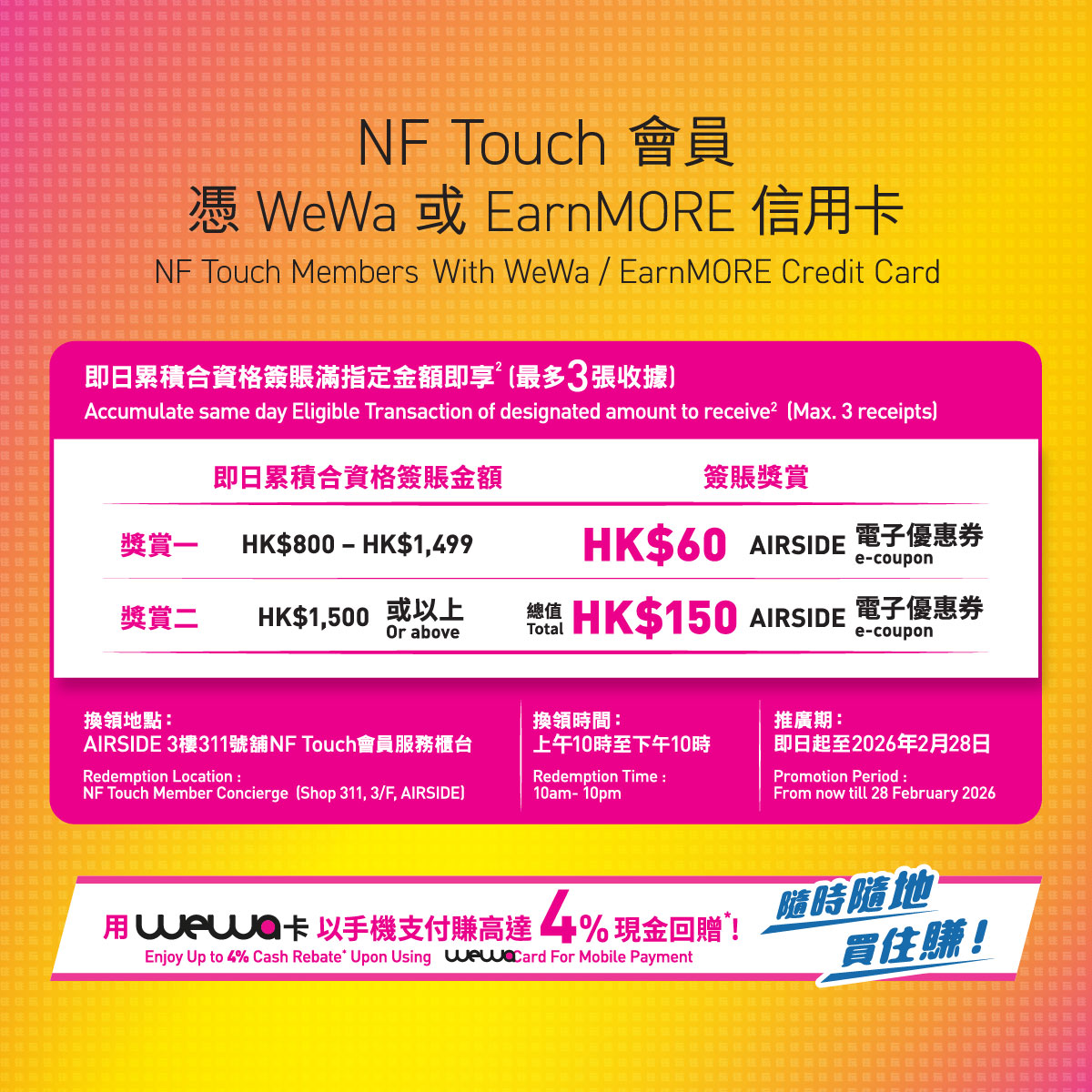 Register as an NF Touch member and spend with your WeWa/EarnMORE Credit Card  to redeem the  exclusive rewards and merchant offers.
