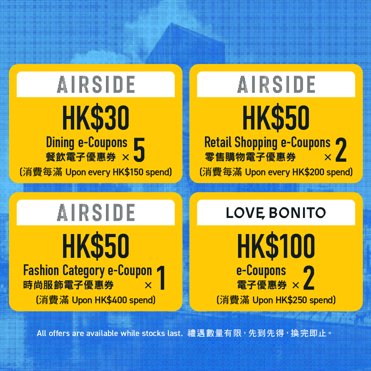 - HK$30 AIRSIDE 餐饮电子优惠券5张 (消费满HK$150可使用)