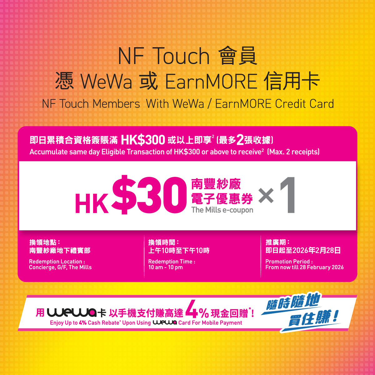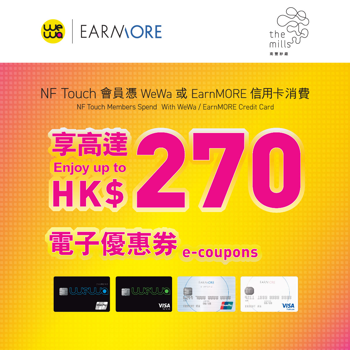 登記成為NF Touch會員並以WeWa/EarnMORE 信用卡即日消費滿指定金額,即可換領以下精彩禮遇及獨家商戶優惠。