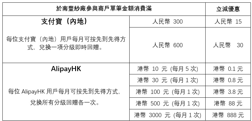 優惠須受有關AlipayHK及支付寶(内地)條款及細則約束,並一概以平台上公布之版本為最終版本。詳情請於支付寶(内地)及AlipayHK手機應用程序上了解更多。