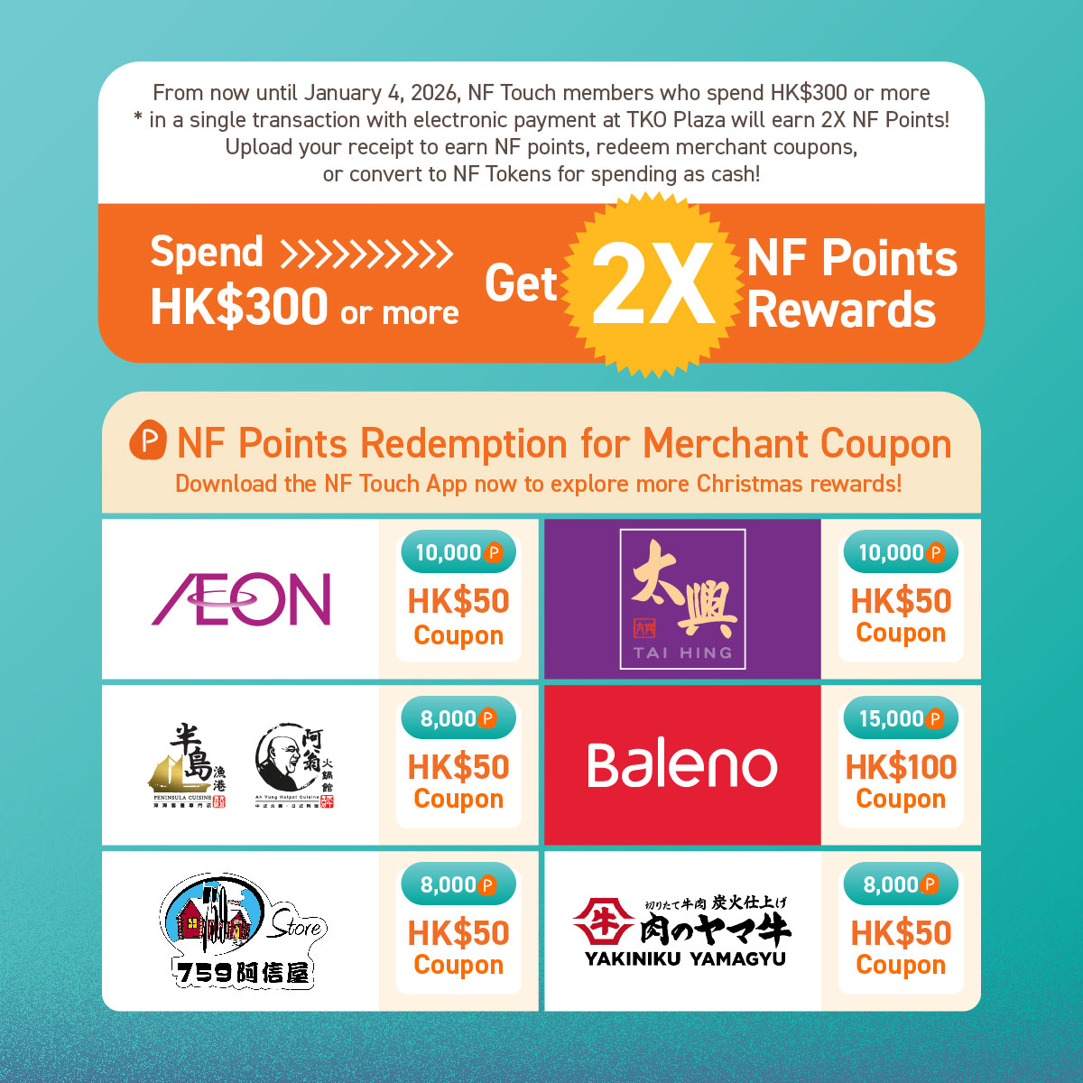 From now until January 4, 2026, NF Touch members who spend HK$300 or more* in a single transaction with electronic payment at TKO Plaza, can register and upload their receipt(s) through the NF Touch mobile app or at the customer service counter to enjoy 2X NF Points rewards! Upload your receipt to earn NF points, redeem merchant coupons, or convert to NF Tokens for spending as cash!